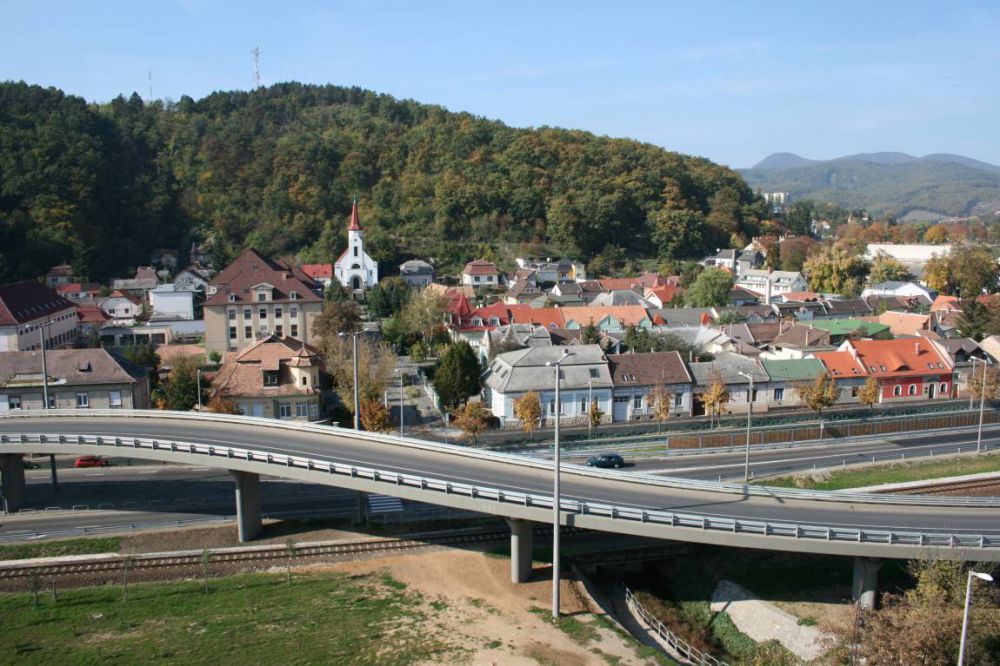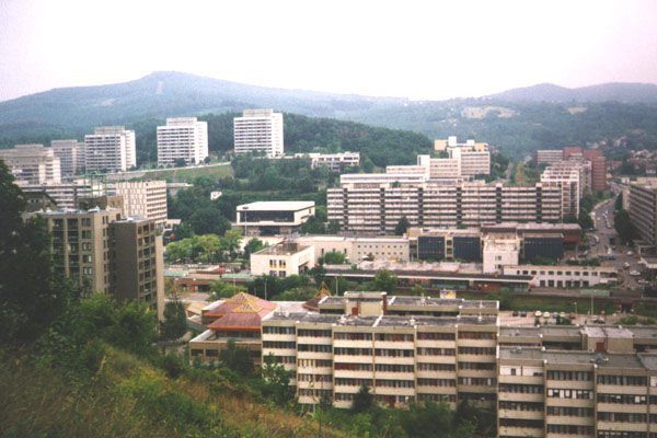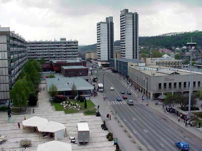 A belváros egy része. Bal - alsó sarokban a Fő - tér egy része látható, egyenesen az égbenyúló "garzon"házakkal.