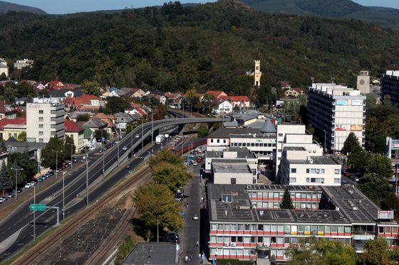 Egy régebbi felvétel a városközpontról. A bal irány felé mepillantható a JAMKK ( József Attila Művelődési Konferencia Központ ), valamint ha a bal - felső sarok felé nézünk, megtalálhatjuk a Kistarján - utat is.